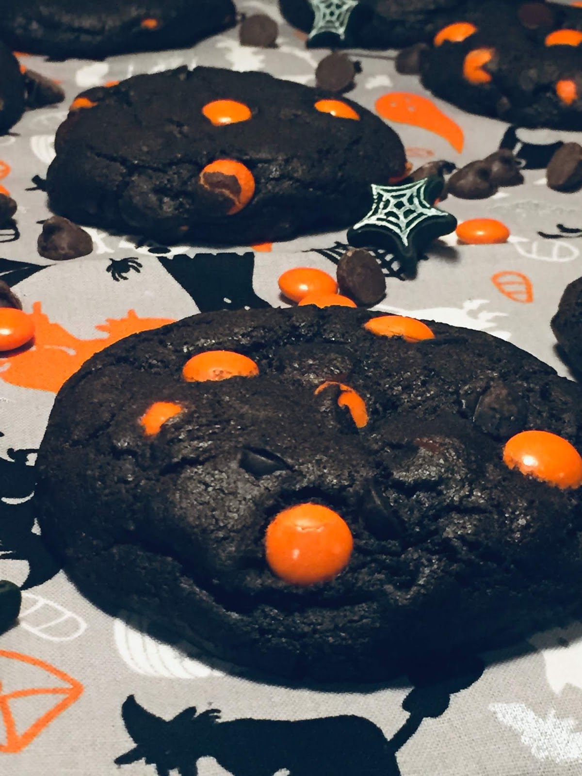 These black-as-night cookies are stuffed with white and orange baking chips, peanut butter chips, and mini Reese's pieces so they're devilishly delicious.